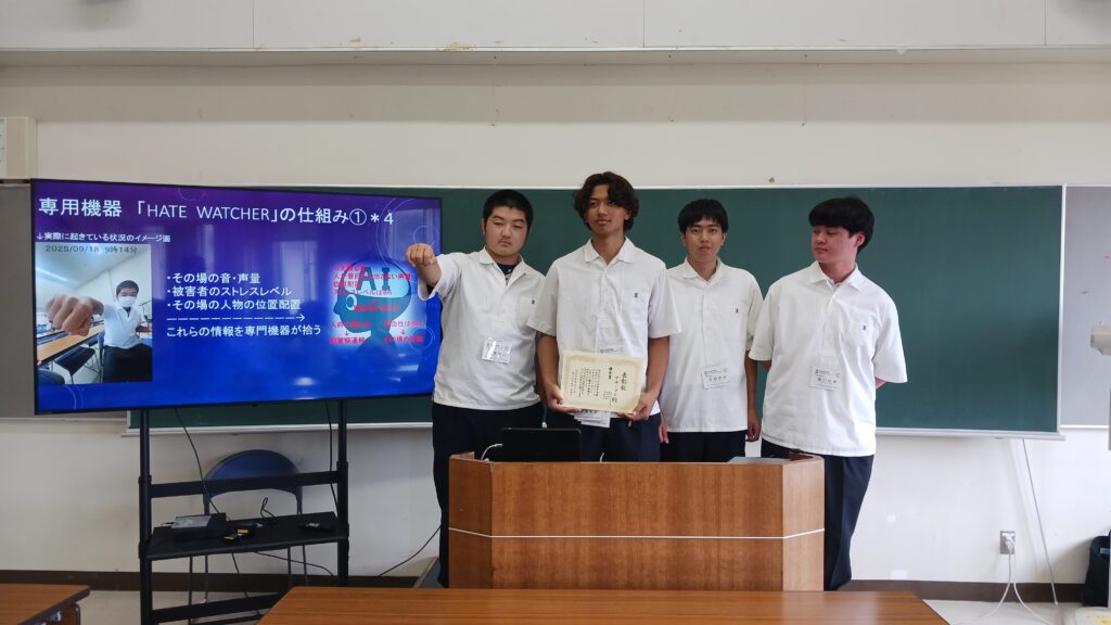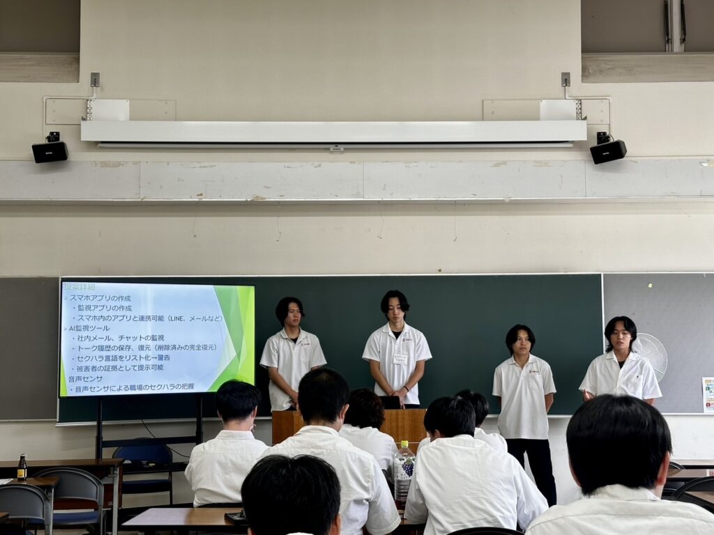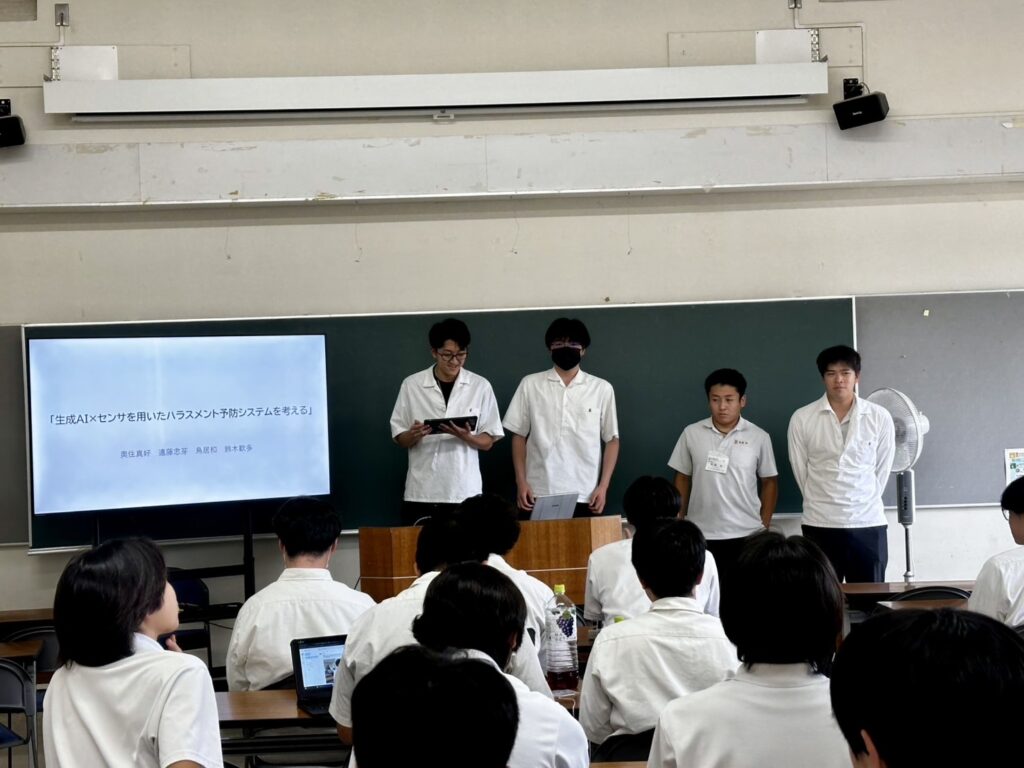 今年は「生成AI✕センサーを用いたハラスメント予防システムを考える」をテーマに、問題分析から解決に向けアイデアを広げ、最終的にサービスやシステムを開発。合宿の最後には、グループ発表を行い、最優秀賞にはグループD「ノーハラ」、優秀賞にはグループC「Hate Watcher」、奨励賞にはグループA「心のHEALTH」情報科賞にはグループE「クールマインドウォッチ」が選ばれ2日間の合宿が終了しました。