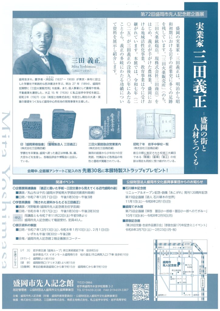 本校の創立者であり実業家、三田義正の没後90年にあたり、盛岡市先人記念館にて企画展「実業家・三田義正-盛岡の街と人材をつくる-」が開催されます。義正の多岐にわたる功績について資料が展示紹介されます。