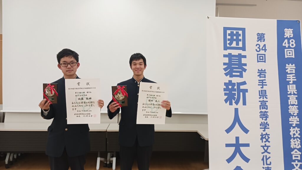 10月3日、4日県高校教育会館で行われました「第34回岩手県高等学校囲碁新人大会」にて、男子個人戦では徳田真人(高校2年)が優勝、佐藤(高校1年)が準優勝となりました。男子団体戦では、徳田(高校2年)、佐藤(高校1年)、佐々木(高校1年)が準優勝となりました。